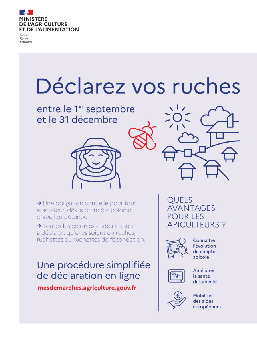 Tout propriétaire ou détenteur de colonies d’abeilles – dès la 1ère ruche – a l’obligation de procéder à une déclaration de détention et d’emplacement de ruches pendant la campagne annuelle qui a lieu entre le 1er septembre et le 31 décembre.